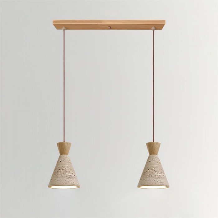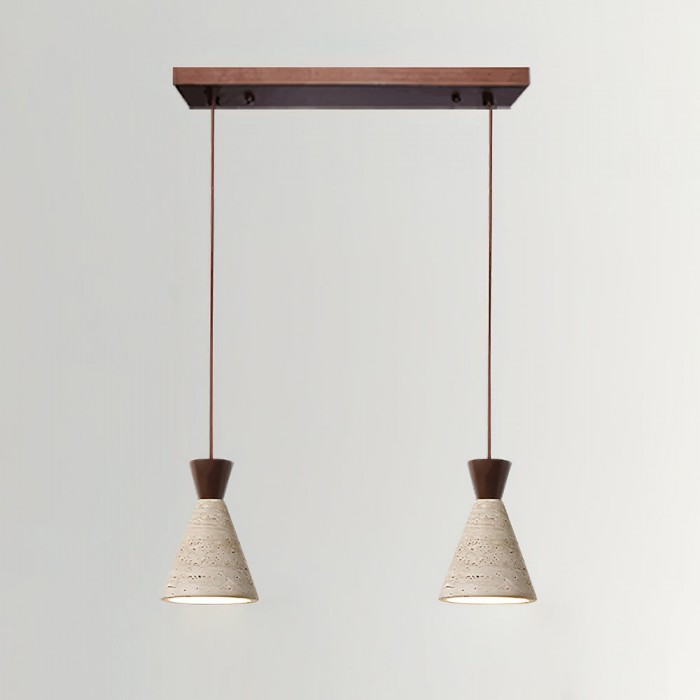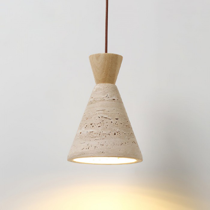 De Cielo hanglamp is een opvallend stuk dat de schoonheid van natuurlijke materialen en minimalistische vormen viert. De conische kap is vervaardigd uit poreus travertijn, een steen met een rijk, tactiel oppervlak dat een uniek samenspel van licht en schaduw creëert. De kap wordt elegant afgewerkt met een eenvoudig, contrasterend houten armatuur in een warme of donkere tint, wat het sculpturale karakter versterkt.