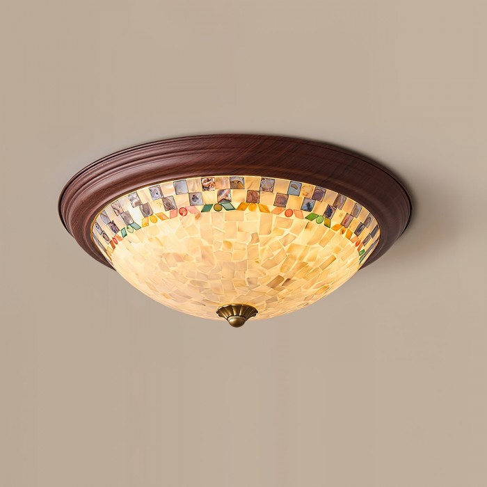 De Corvielle plafondlamp belichaamt tijdloze kunstzinnigheid door een mozaïek van iriserende parelmoertegels, subtiel geaccentueerd met kleuraccenten en bekroond door een warm houten frame met watertransferprint. De handgemaakte koepel verspreidt een zachte, elegante gloed die zowel klassieke als moderne interieurs verfraait. Door organische texturen te combineren met verfijnde geometrie, transformeert Corvielle het plafond in een canvas van ingetogen luxe – waar natuurlijke glans en ambachtelijke details in perfecte harmonie samenkomen.