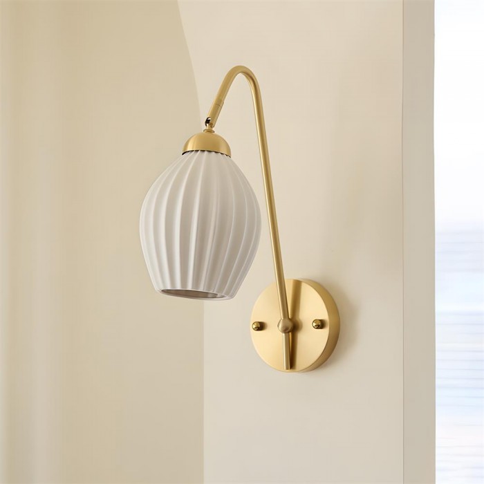 De Dorelia wandlamp combineert een elegante vorm met ingetogen luxe en geeft de muur een verfijnde, sculpturale uitstraling. De slanke arm van geborsteld messing buigt in een zachte, elegante boog en creëert een gevoel van beweging dat prachtig contrasteert met de strakke geometrie van de geplooide witte kap. De geribbelde diffuser voegt textuur en diepte toe en filtert het licht zachtjes, waardoor een warme en uitnodigende gloed ontstaat die zowel verfijnd als sereen aanvoelt.