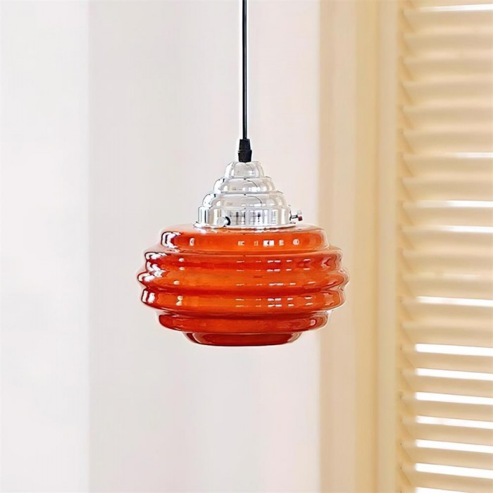De Gelato hanglamp is een heerlijke mix van retro charme en speelse moderniteit. Met zijn gelaagde, golvende glazen kap die doet denken aan een werveling van softijs, brengt deze lamp een nostalgische maar verfijnde sfeer in elke ruimte. De verchroomde kap voegt een vleugje industriële elegantie toe en vormt een mooi contrast met het snoepkleurige glas en een eigentijdse uitstraling. Verkrijgbaar in warme rode en beige tinten.