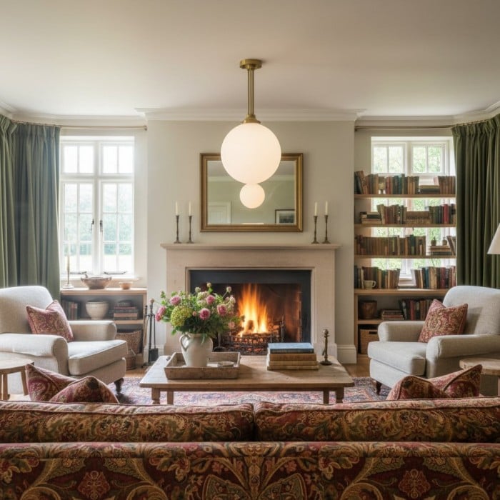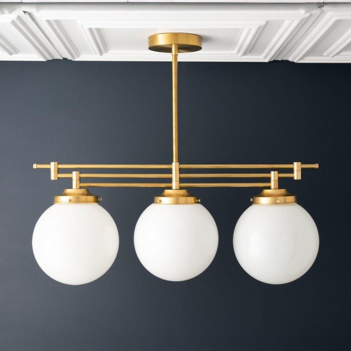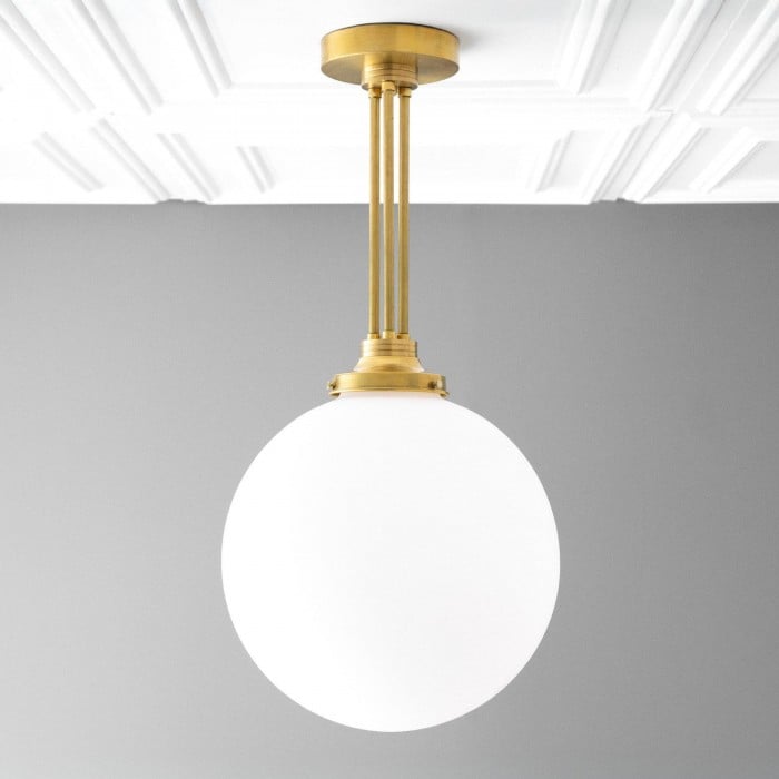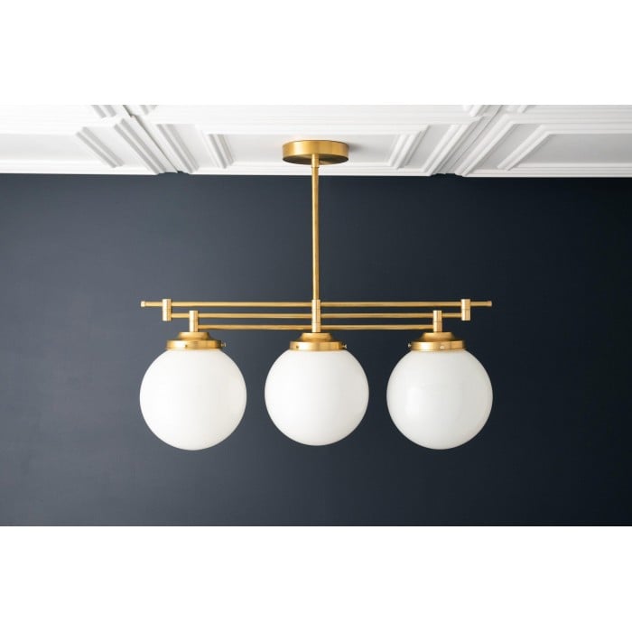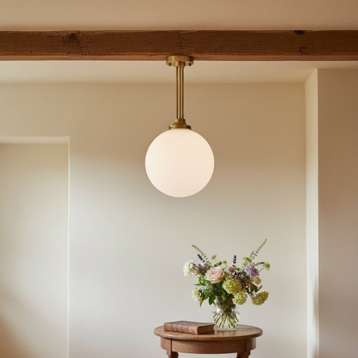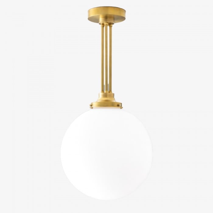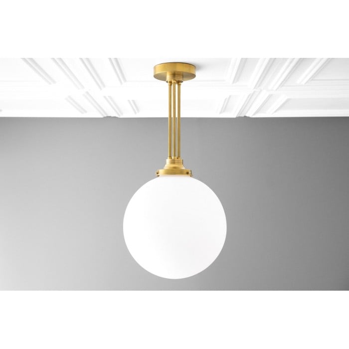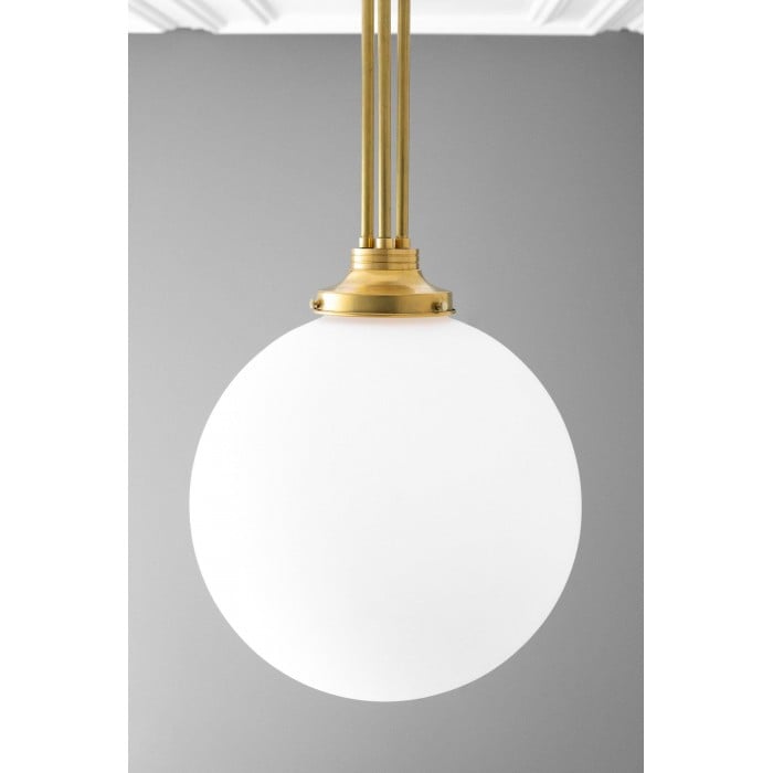 Een verfijnde hanglamp met een grote bol van mat glas en decoratieve messing staven, geïnspireerd op art-decodesign. De bol van 30 cm verspreidt het licht zacht en voegt warmte en elegantie toe. Ideaal voor keukens, gangen en woonkamers, combineert dit opvallende stuk vintage details met een moderne uitstraling.