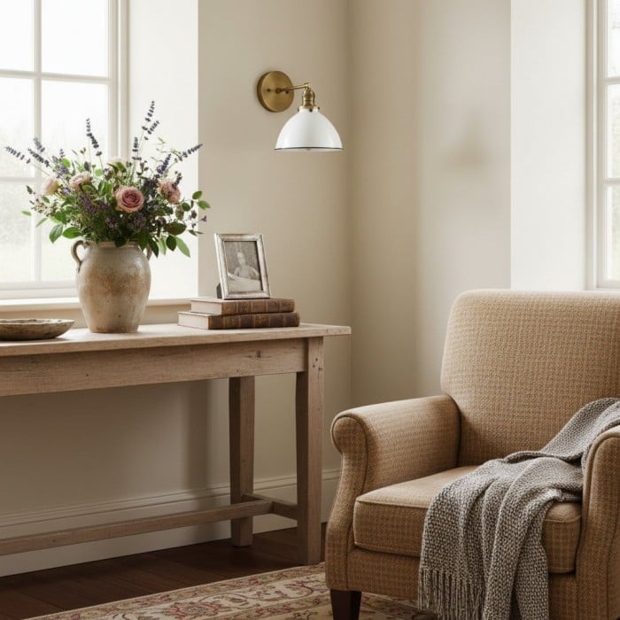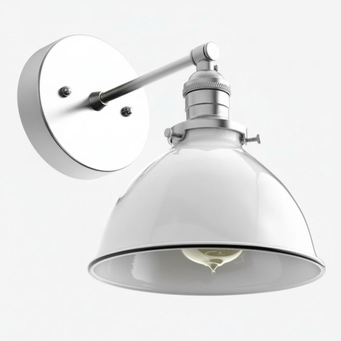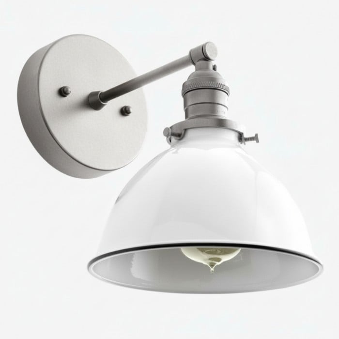 Deze wandlamp van geborsteld nikkel met een witte kap van 18 cm biedt een strakke, industriële look met een vleugje landelijke elegantie. Hij is ontworpen voor zowel moderne als moderne interieurs en zorgt voor zacht sfeerlicht, terwijl hij ook dienstdoet als stijlvol accent voor badkamers, keukens of woonruimtes.