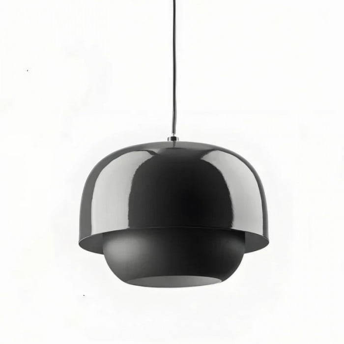 Deze retro-moderne metalen hanglamp is een prachtige toevoeging aan elke moderne ruimte. De lamp heeft twee in elkaar passende kappen: een glanzende metalen buitenkant en een matte binnenkant, wat een uniek visueel effect creëert. Perfect voor in de eetkamer, keuken of hal, deze hanglamp dient als een stijlvol middelpunt.