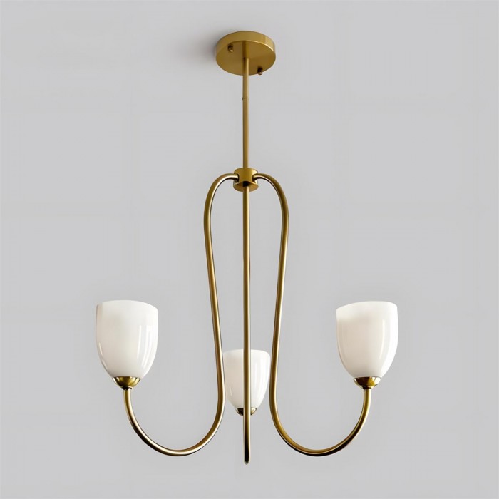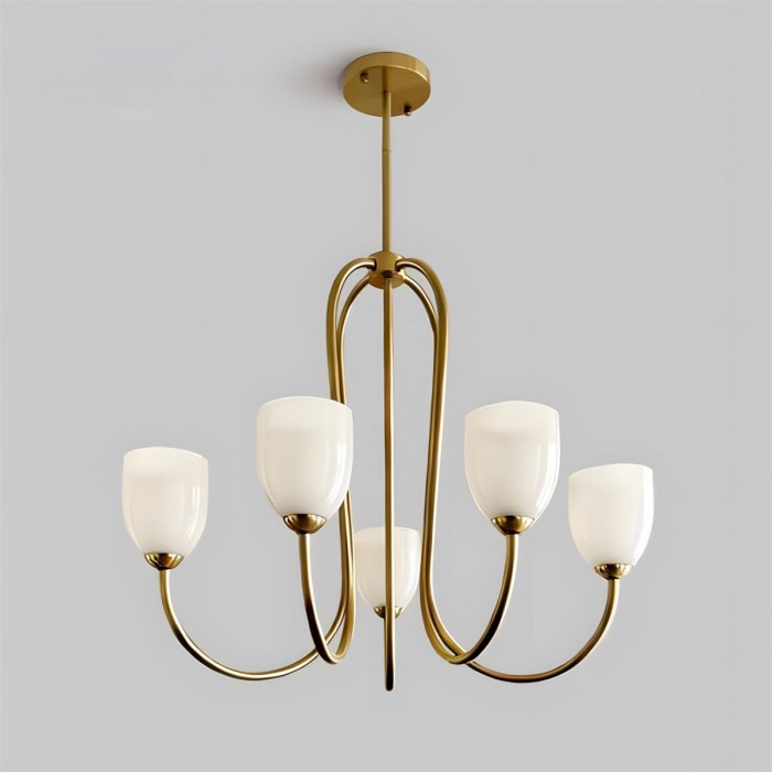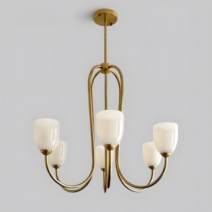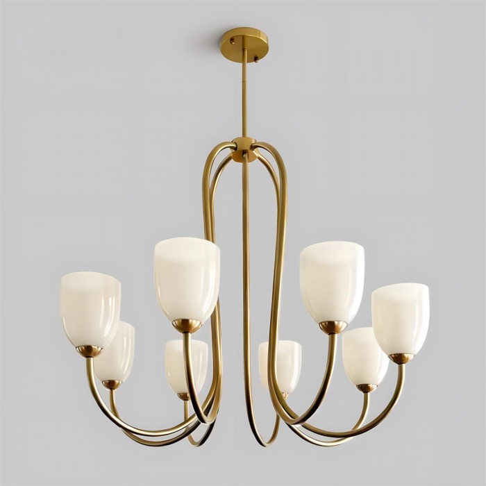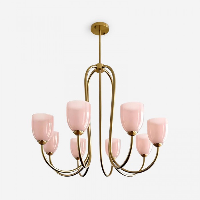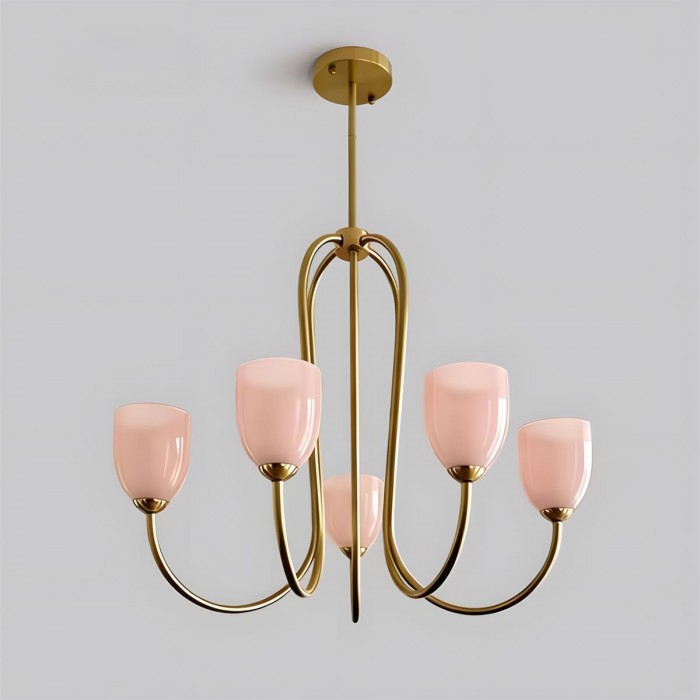 De Mild Velin kroonluchter volgt sierlijke rondingen naar een vloeiend, lintachtig silhouet dat zowel gestructureerd als moeiteloos zacht aanvoelt. De gebogen armen creëren een gevoel van subtiele beweging, terwijl de tulpvormige glazen kappen – verkrijgbaar in warm ivoor of zachtroze – het licht verspreiden tot een zachte, flatterende gloed. De balans tussen sculpturale metalen lijnen en delicate glazen vormen zorgt voor verfijnde elegantie zonder zwaar aan te voelen.