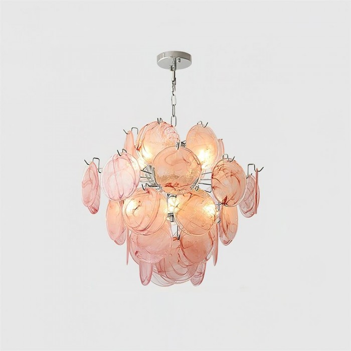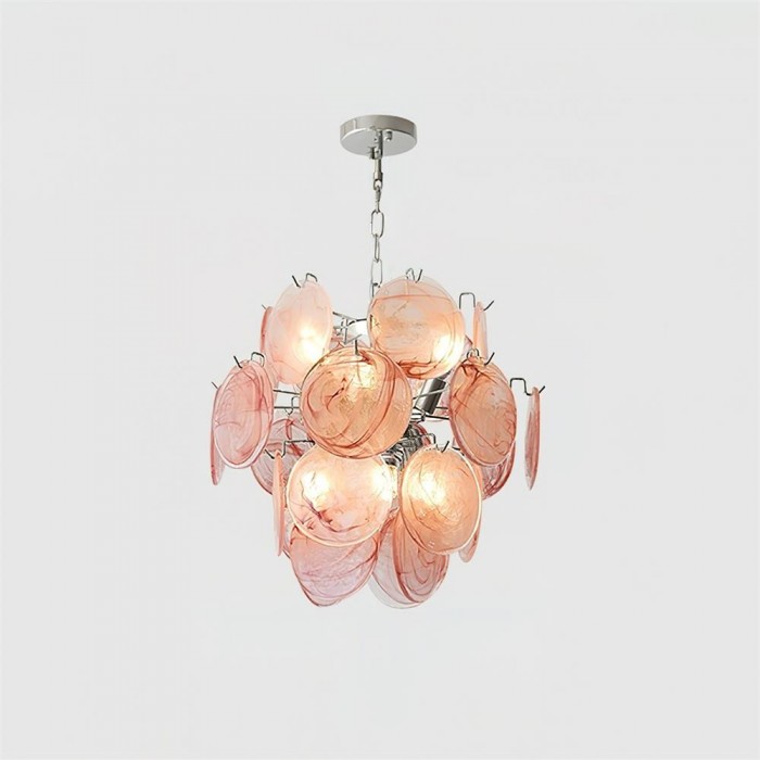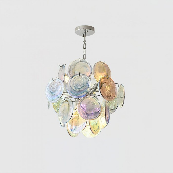De Neuvy glazen kroonluchter is een stralende fusie van kunst en licht en transformeert elke ruimte in een galerij van kleur en beweging. Elke schijf is handgemaakt van iriserend glas. De ronde platen lijken in de lucht te zweven en vangen en breken het licht met een oogverblindende schittering. Deze blikvanger, opgehangen aan een elegant chromen frame, is zowel speels als verfijnd – ideaal voor eetkamers, lofts of elke andere ruimte die behoefte heeft aan creatieve verlichting. Kies uw kleurenpalet en laat uw plafond tot leven komen met sculpturale elegantie.