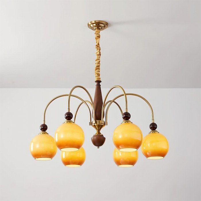 De Solstice Glow kroonluchter straalt een warme, uitnodigende gloed uit en vangt de essentie van het gouden uur in zijn gloeiende glazen bollen. Hangend aan sierlijk gebogen messing armen en verankerd door rijke houten accenten, combineert de sculpturale vorm de elegantie van het midden van de vorige eeuw met een vleugje moderne nostalgie. Perfect voor eetkamers of woonkamers, maakt dit stuk van elke bijeenkomst een feest in een gouden licht.