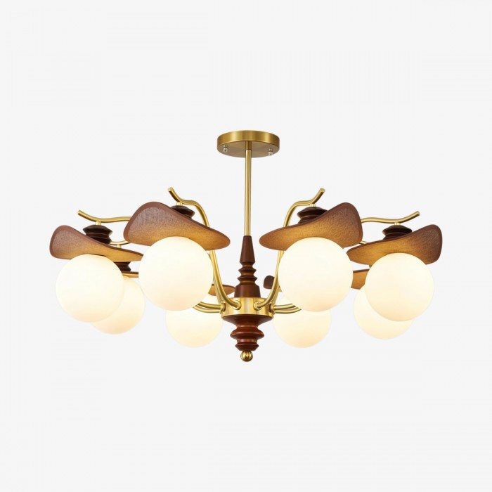 De Solvane kroonluchter heeft glazen kappen in combinatie met houten en metalen elementen, wat resulteert in een evenwichtige compositie met meerdere armen. Ontworpen voor binnenruimtes, brengt hij warm licht en een verfijnde structuur in eetkamers en woonkamers.