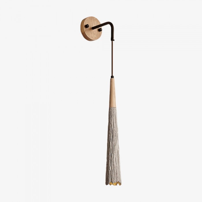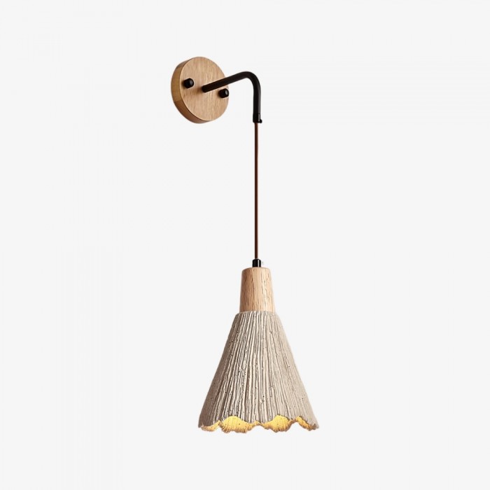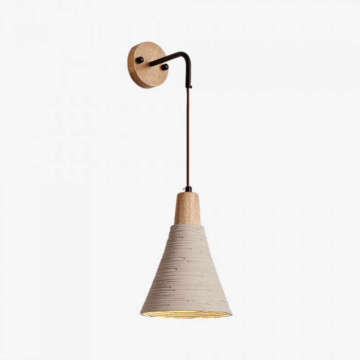 Deze minimalistische, industriële wandlamp heeft een taps toelopende kap van microcement op een houten voet met een metalen arm, die zacht, naar beneden gericht licht verspreidt. Ideaal voor woonkamers, slaapkamers, gangen en knusse hoekjes in moderne of wabi-sabi interieurs.