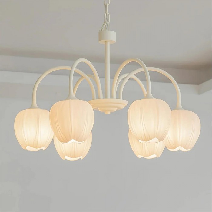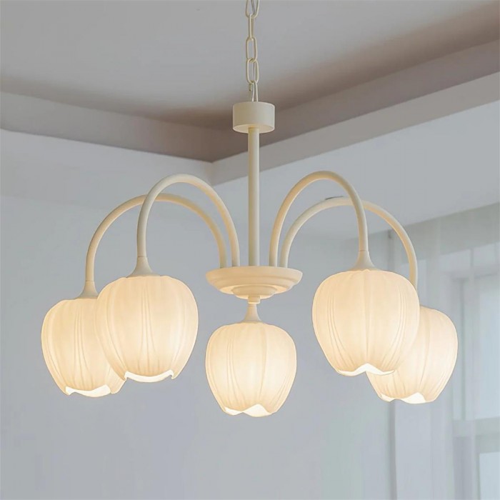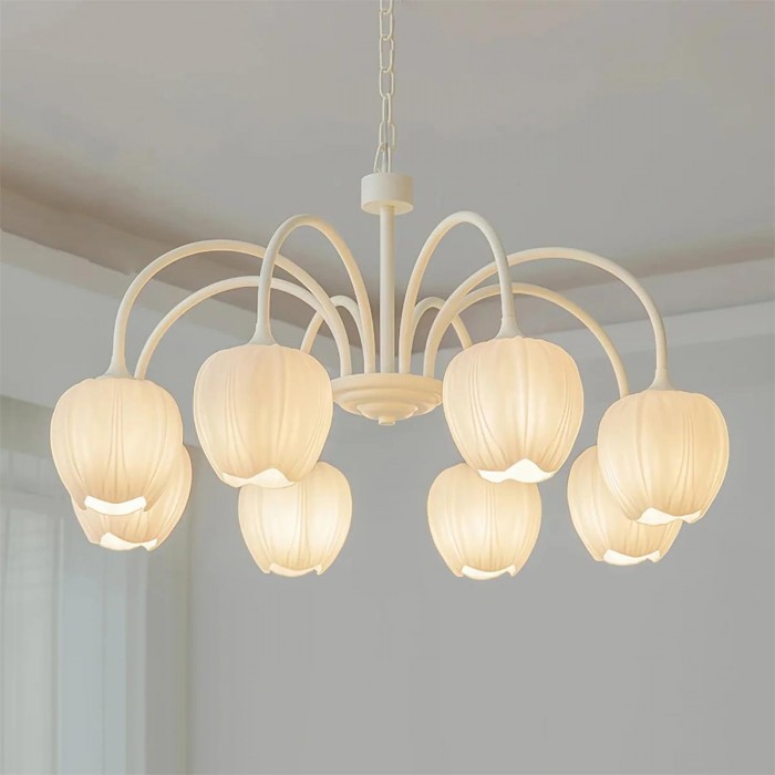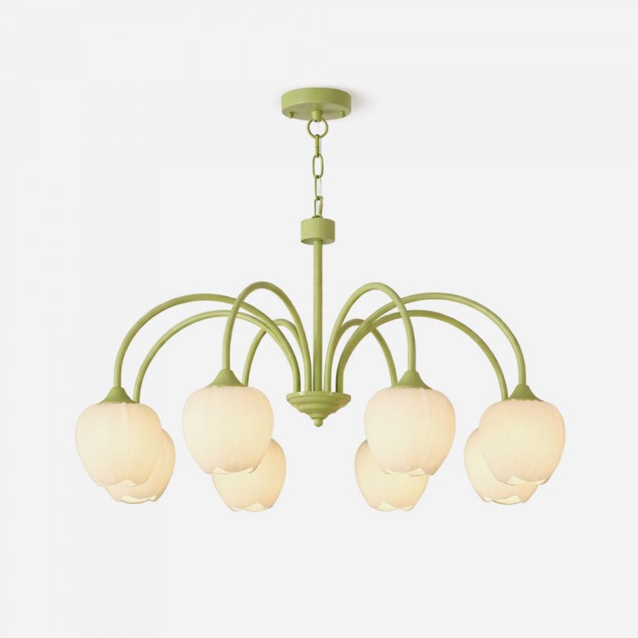 De Tulip Matcha kroonluchter brengt een zachte, botanische charme in het interieur dankzij de sierlijk gebogen armen en de op tulpen geïnspireerde kappen, waardoor een silhouet ontstaat dat zowel speels als elegant aanvoelt. De frisse matcha groene of warme ivoorkleurige afwerking geeft de lamp een lichte, luchtige uitstraling, terwijl de subtiel geribbelde glazen kappen op bloeiende bloemblaadjes lijken en het licht verspreiden tot een zachte, rustgevende gloed. De afgeronde vorm geeft de lamp een evenwichtig, bloemrijk ritme dat speels maar verfijnd aanvoelt, waardoor het meer is dan alleen een lamp – het wordt een decoratief middelpunt.