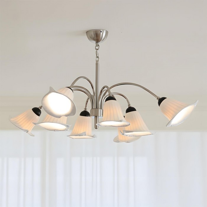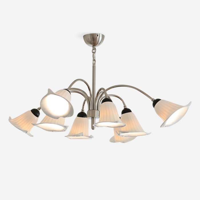 De Vellina Petal kroonluchter brengt een sierlijke, botanische elegantie naar uw plafond, met zes zacht uitlopende, bloembladvormige keramische lampenkappen die bloeien vanuit slanke, gebogen armen. Het vloeiende silhouet vangt de lichtheid van een bloem in beweging, terwijl het geborstelde metalen frame een verfijnde, eigentijdse touch toevoegt. Zachte, diffuse verlichting vult de ruimte met een warme, uitnodigende gloed, waardoor Vellina een prachtig sculpturaal middelpunt is voor eetkamers, woonkamers of elke andere ruimte die vraagt om een vleugje poëtische charme.