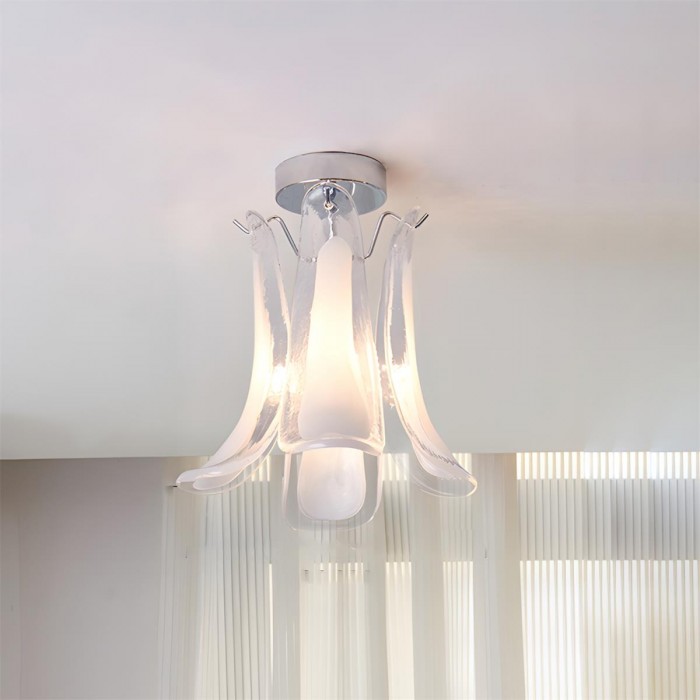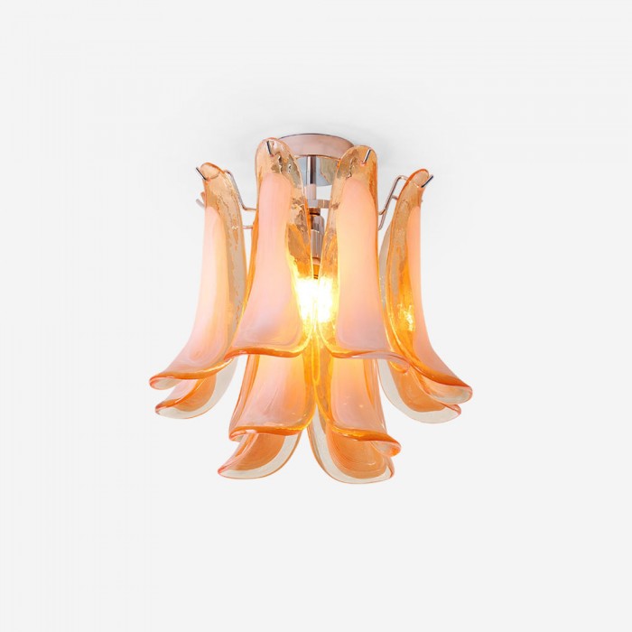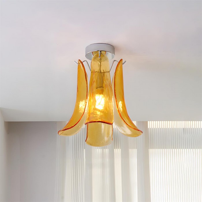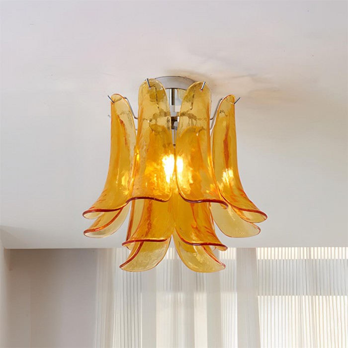 De Verdelia plafondlamp voegt een sculpturaal drama toe aan het plafond met zijn waterval van handgevormde glazen bloemblaadjes, elk gekruld als een bloeiende lelie in beweging. Verkrijgbaar in een reeks doorschijnende juweeltinten, straalt de lamp een warme, organische gloed uit die prachtig verandert naarmate het licht door de vloeiende, golvende randen filtert. Elegant en expressief tegelijk, transformeert Verdelia elke ruimte in een zacht verlicht kunstwerk – een opvallende mix van modern vakmanschap, kleur en botanische inspiratie.