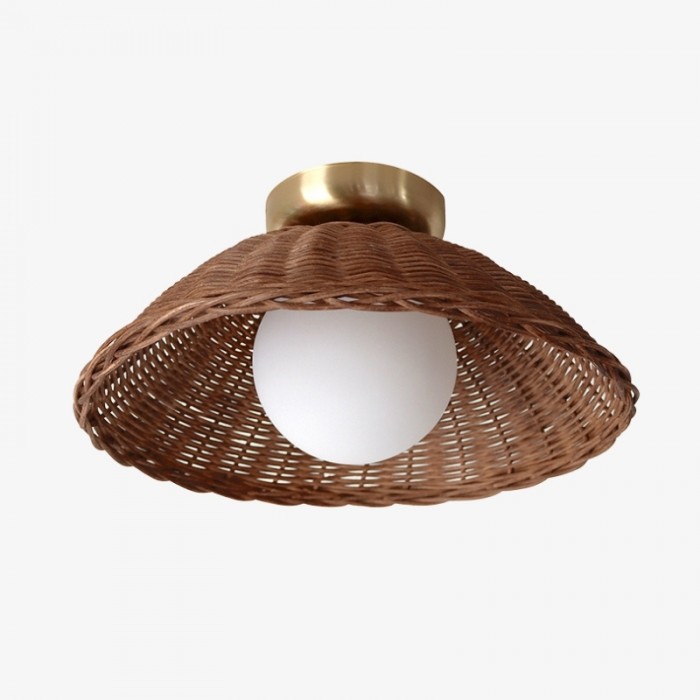 Deze veelzijdige lamp heeft een geweven buitenkap en een gladde glazen diffuser, wat zorgt voor een gelaagde, tactiele uitstraling. Hij is ontworpen voor dubbele montage en kan zowel aan de muur als aan het plafond worden gemonteerd. Zelfs zonder licht voegt hij warmte en diepte toe, ideaal voor slaapkamers, gangen en ontspannen woonruimtes.