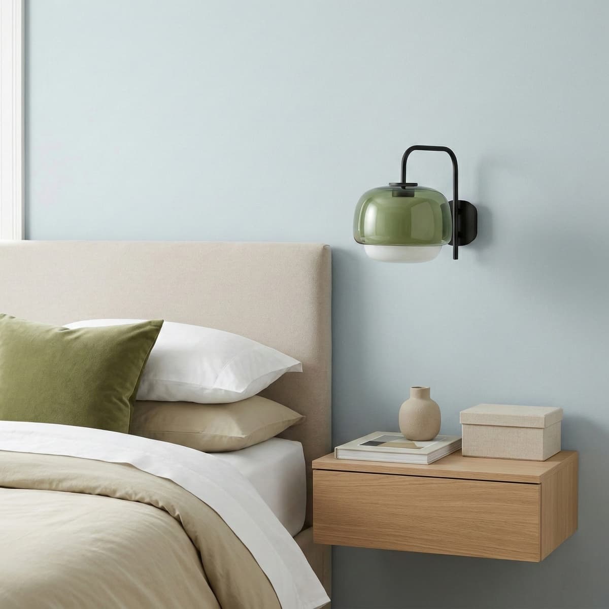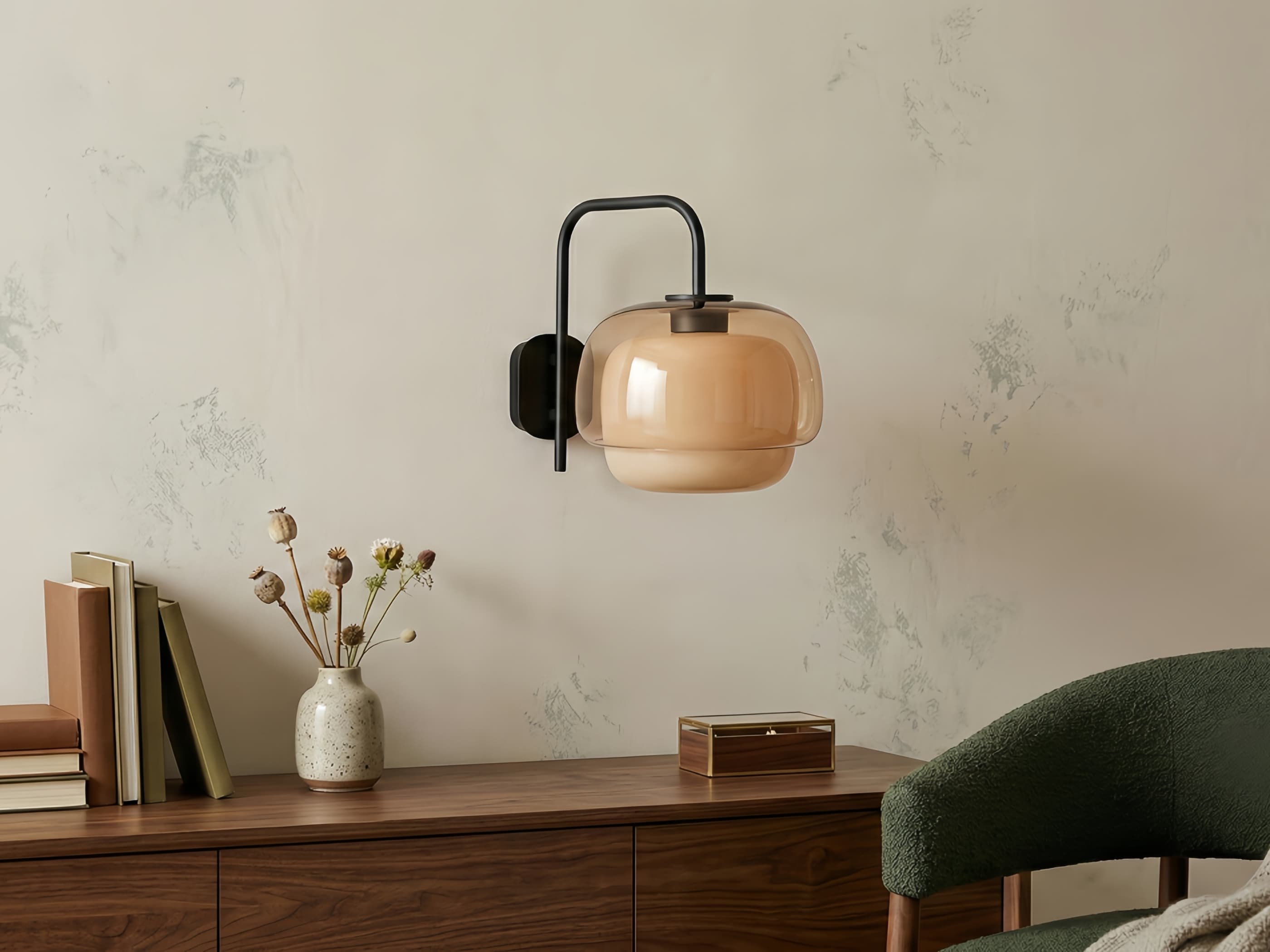 Denna färgglada vägglampa i glas har en distinkt svampformad silhuett i två lager, där transparent och ogenomskinligt glas blandas för ett dimensionellt djup. Den munblåsta glasskärmen visar upp unika hantverksmässiga variationer i varje möbel. Dess kapslade sfärdesign skapar mjuk, diffus belysning som är perfekt för entréer eller loungeutrymmen.
