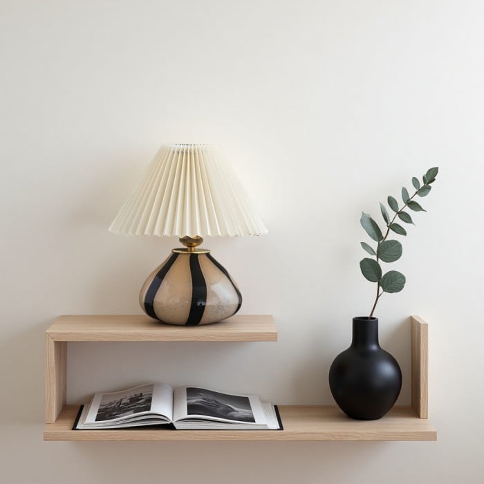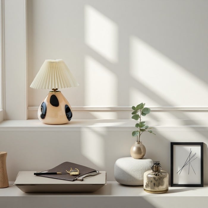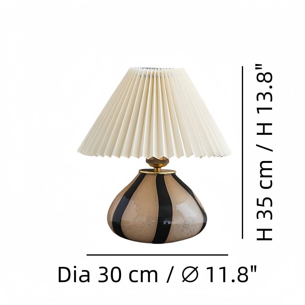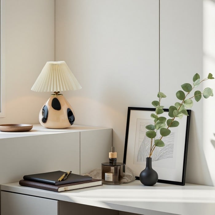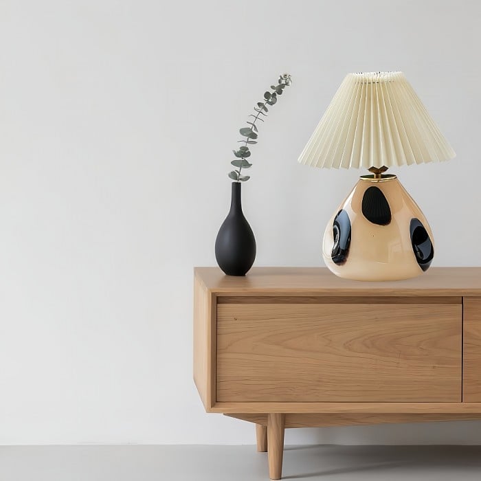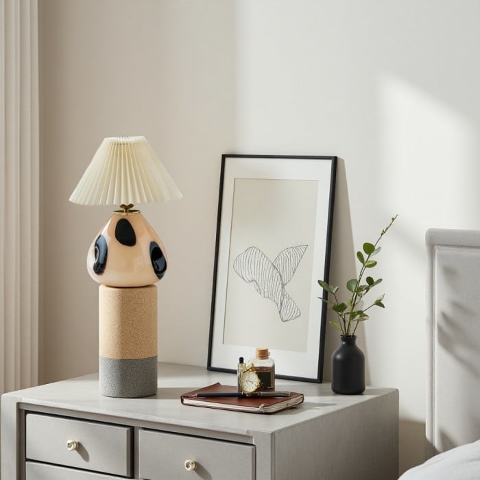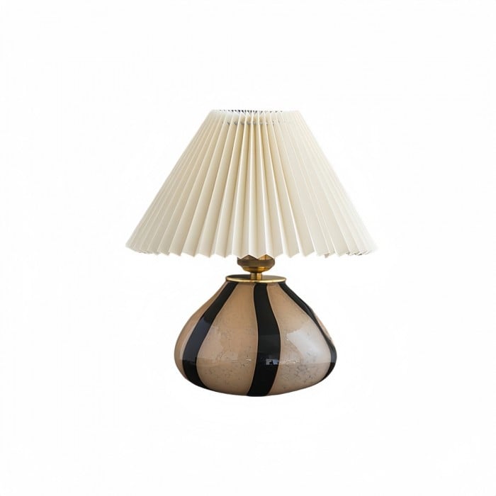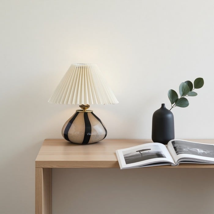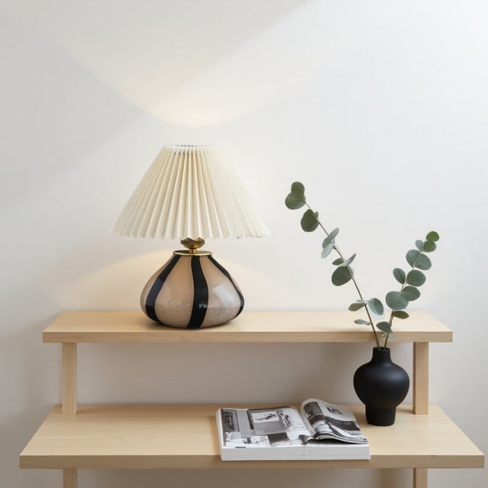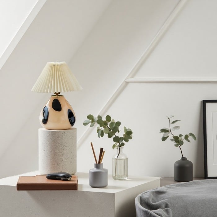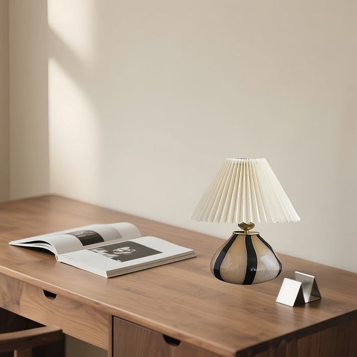 Denna veckade bordslampa kombinerar texturerat tyg med slätt mjölkglas för en taktil kontrast. Som veckad sänglampa erbjuder den perfekt stämningsbelysning för nattlig läsning och avkoppling. Inspirerad av den veckade paraplylampan skapar denna enkla designade glasbordslampa med tygskärm en skulptural silhuett för moderna interiörer.
