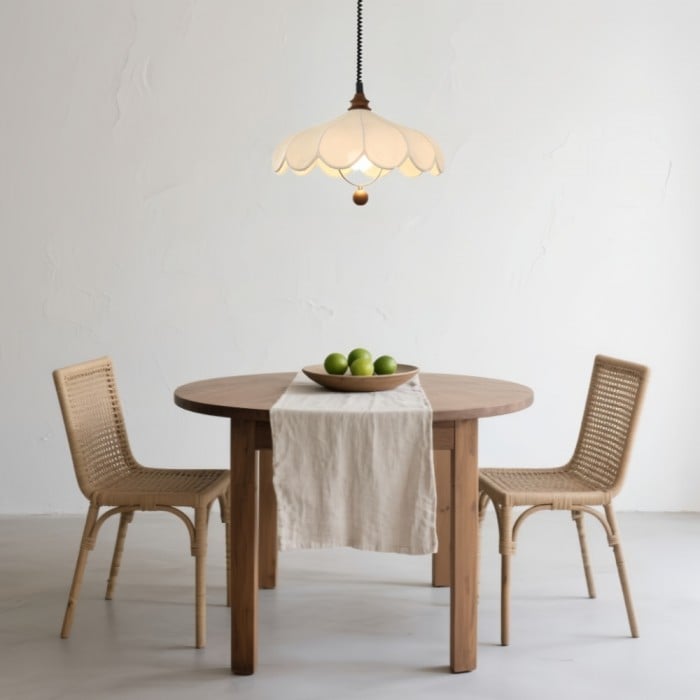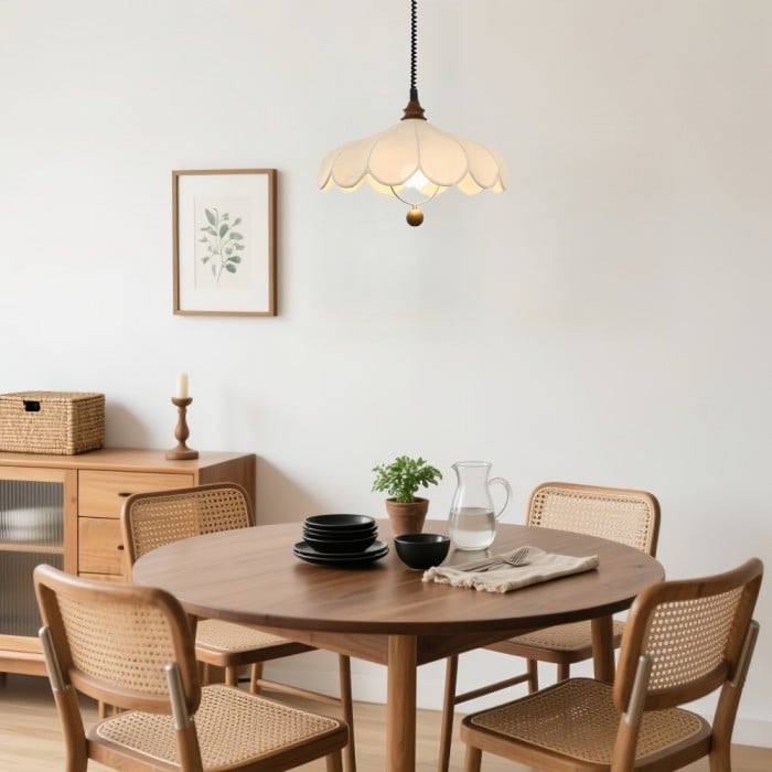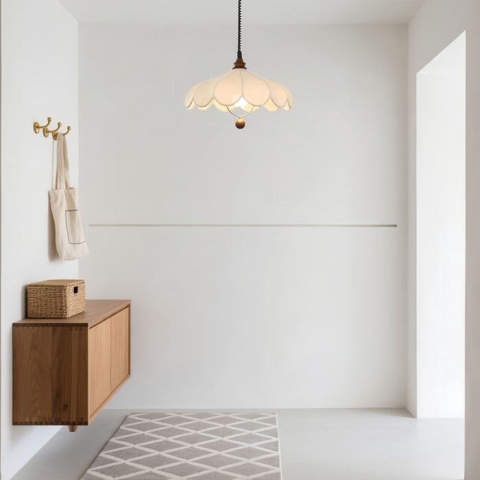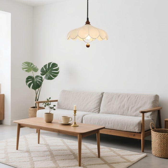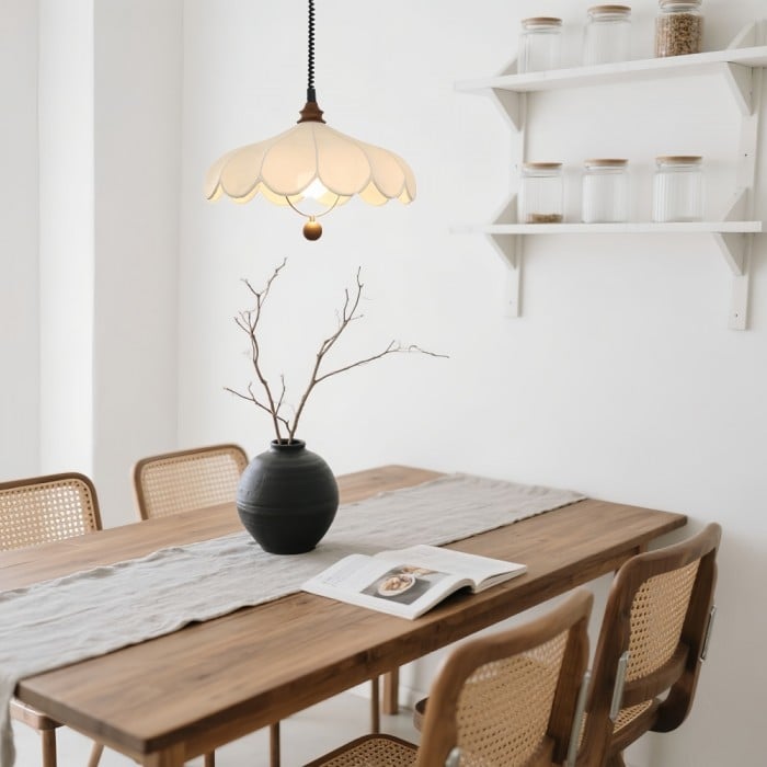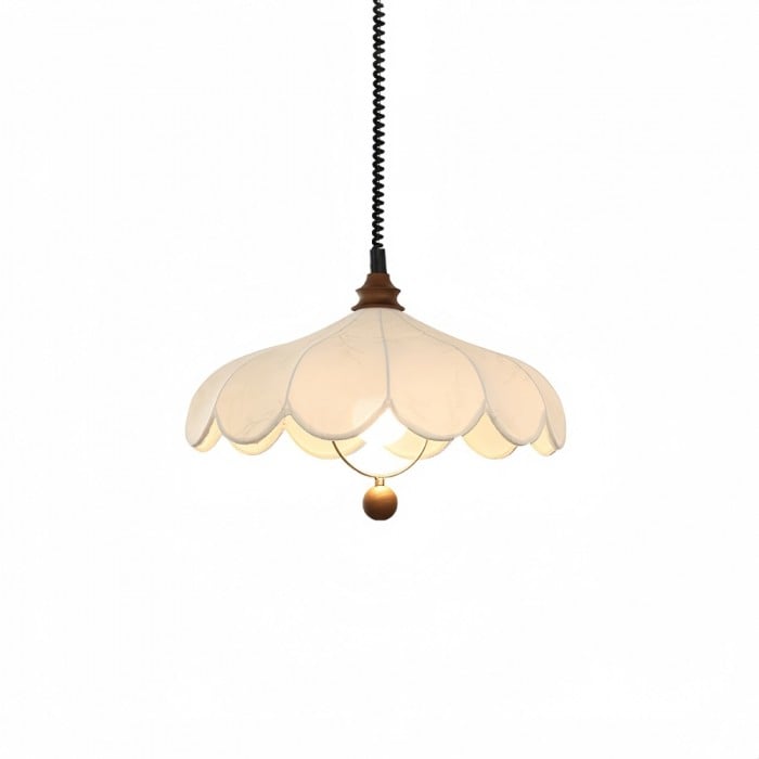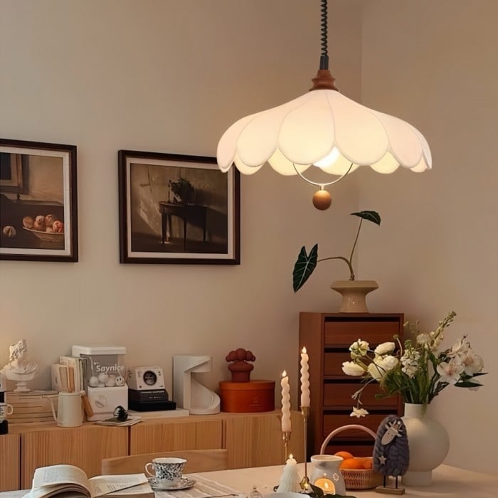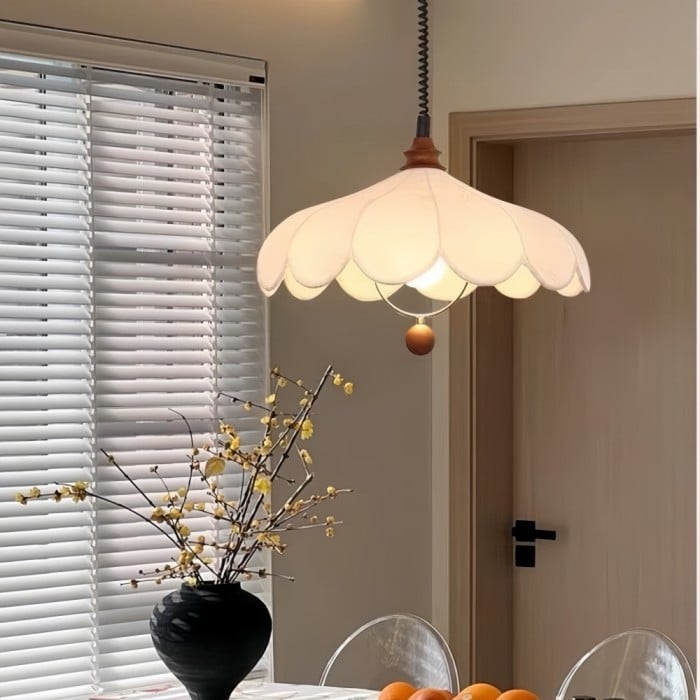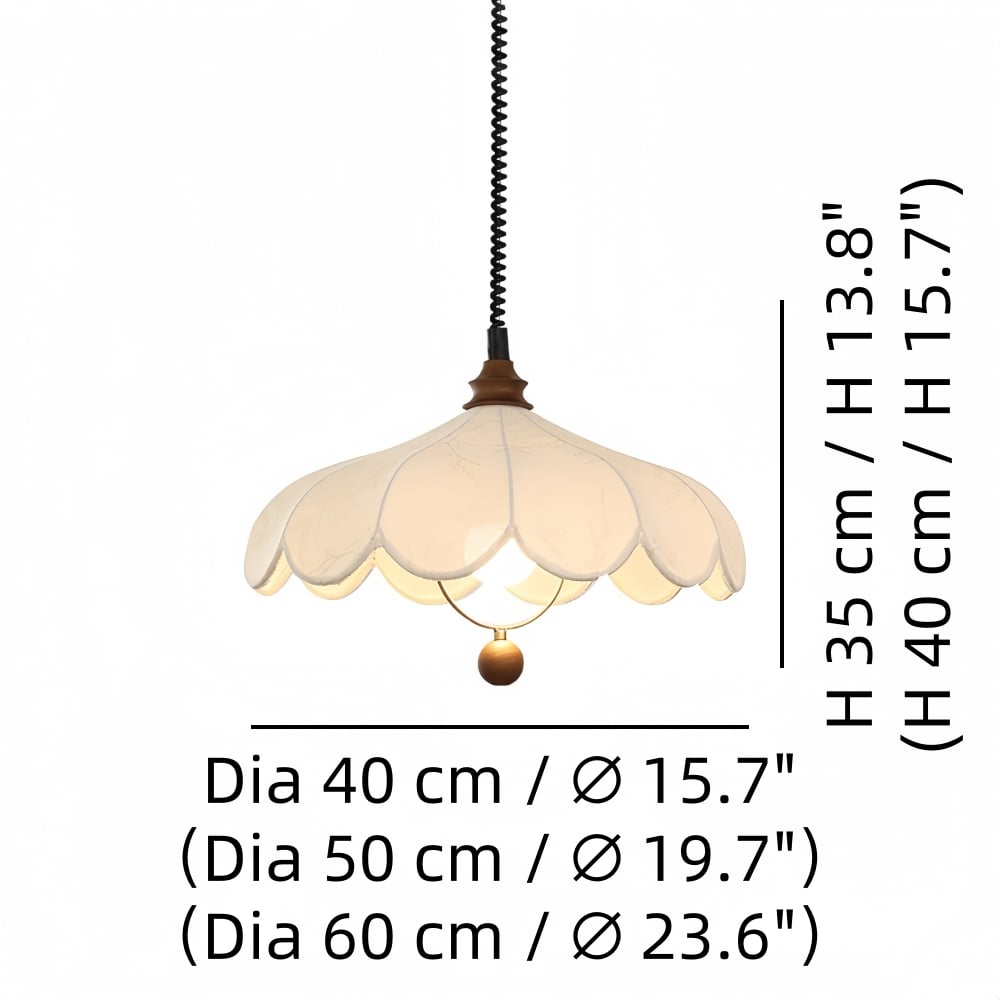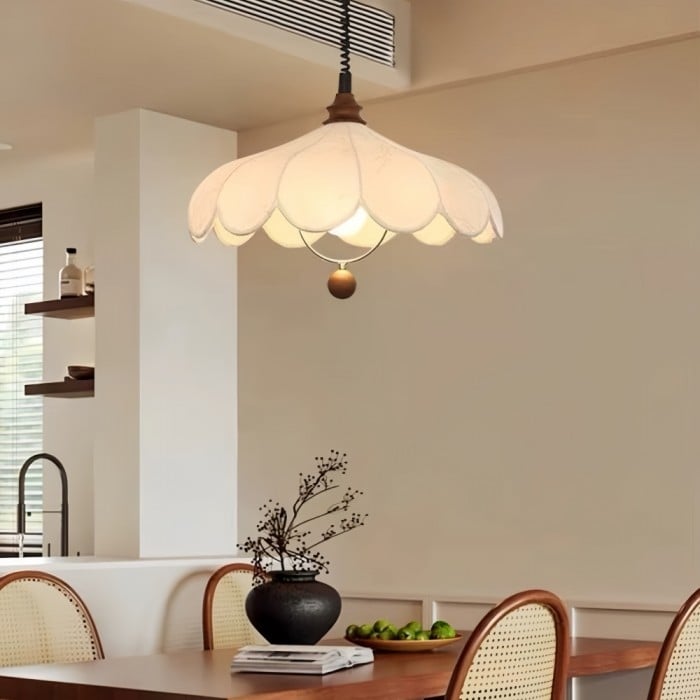 Denna tygpendellampa fångar den delikata skönheten hos blommiga blommor genom lager på lager av tyg. Blompendellampan skapar ett mjukt organiskt sken som förhöjer matmiljön med naturlig elegans. Den franska kronbladspendellampan ger konstnärlig sofistikering till moderna interiörer.