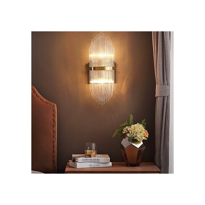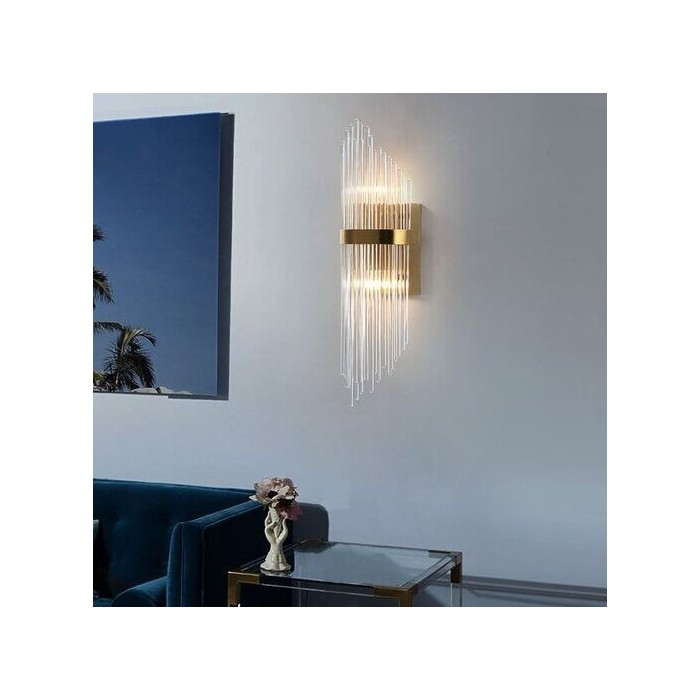Utmärkt modernistisk kristallvägglampa består av starkt alternerande glaskristallstavar som bildar flera lager. Skulpturell design med skyskrapaelement i art déco-stil. Har stora mässings mittlinjedetaljer, såväl som mässingsramar och beslag. Nyligen led och utrustad med två lampor som lyser upp och ner. Den centrala mässingskroppen har två galler för att hålla glaskristallstavar.