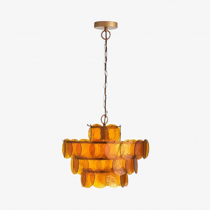 Med en serie färgglada glasskivor upphängda i en elegant metallram skapar denna moderna belysningsarmatur ett varmt och inbjudande sken som förhöjer alla interiörer. Dess moderna design kompletterar både matsalar, vardagsrum, sovrum, kök och exklusiva kommersiella utrymmen. Finns i flera storlekar och färgalternativ för att passa olika designteman.