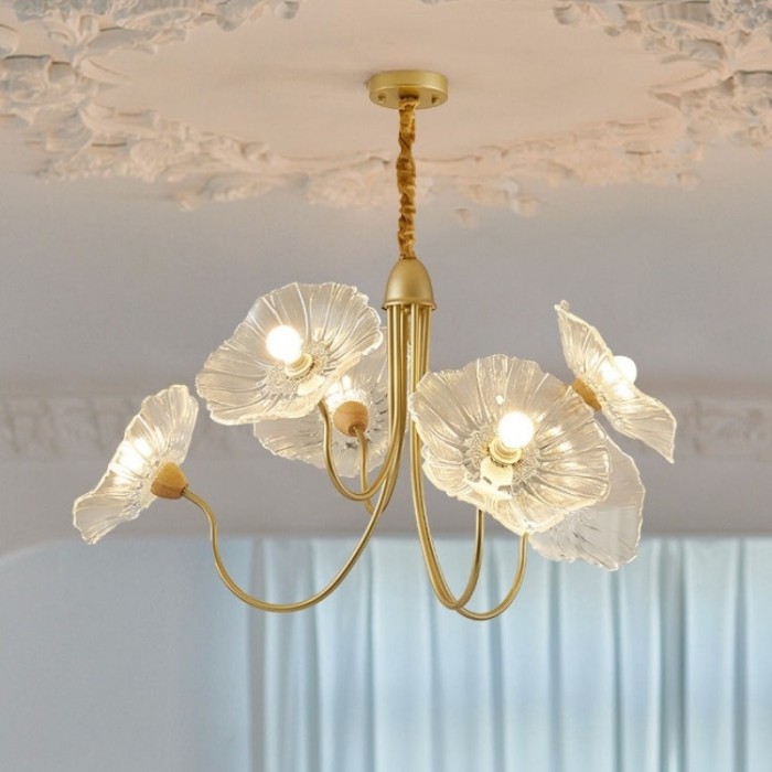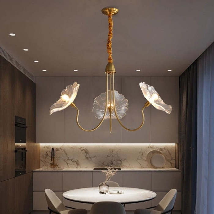 Den nordiska Lotus Leaf Glass Flower Pendellampa kombinerar perfekt nordisk minimalistisk stil med naturliga element. Varje lotusbladformad glaslampskärm på kristallkronan är som ett utsökt konstverk, som hänger lätt och elegant i luften och ger en touch av friskhet och vitalitet till utrymmet. De noggrant utformade linjerna och det mjuka ljuset från den flerhövdade lotusbladkronan skapar en varm och fridfull atmosfär som passar för vardagsrum, matsalar eller sovrum.