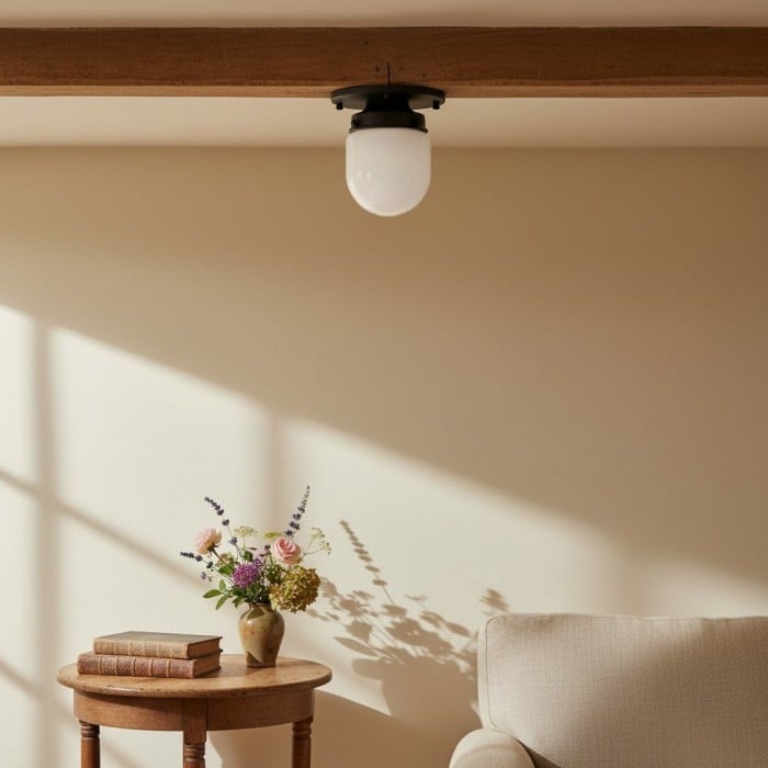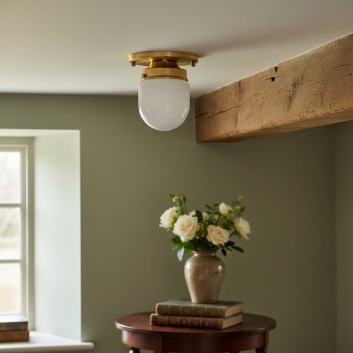 Förhöj kompakta utrymmen med den infällda taklampan Opalume Glass, designad med en kulformad opalglasglob. Inspirerad av art déco-stilen ger denna armatur ett mjukt, stämningsfullt sken samtidigt som den sparar utrymme. Perfekt för hallar, entréer eller områden med lågt i tak som söker tidlös elegans.