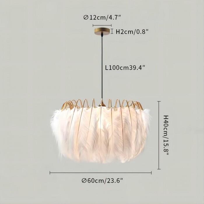 Denna glamorösa fjäderlampa har lyxiga svarta eller vita fjädrar som hålls på plats av en metalltrådsram i guld. Finns i kolsvart eller obefläckat vitt. Omgiven av lyxiga fjädrar för ett vackert, ädelt sken, är denna taklampa perfekt för ett vardagsrum eller bankettrum för att accentuera atmosfären. Lamporna har en ring av autentiska fjädrar fästa av en serie armar av metall i guld som lyser och skimrar förföriskt när de tänds. Mjuka och delikata, ljusen påminner om de eleganta fjäderboorna och dekadenta hattarna från förr, men designen är helt samtida.
