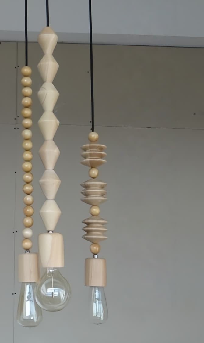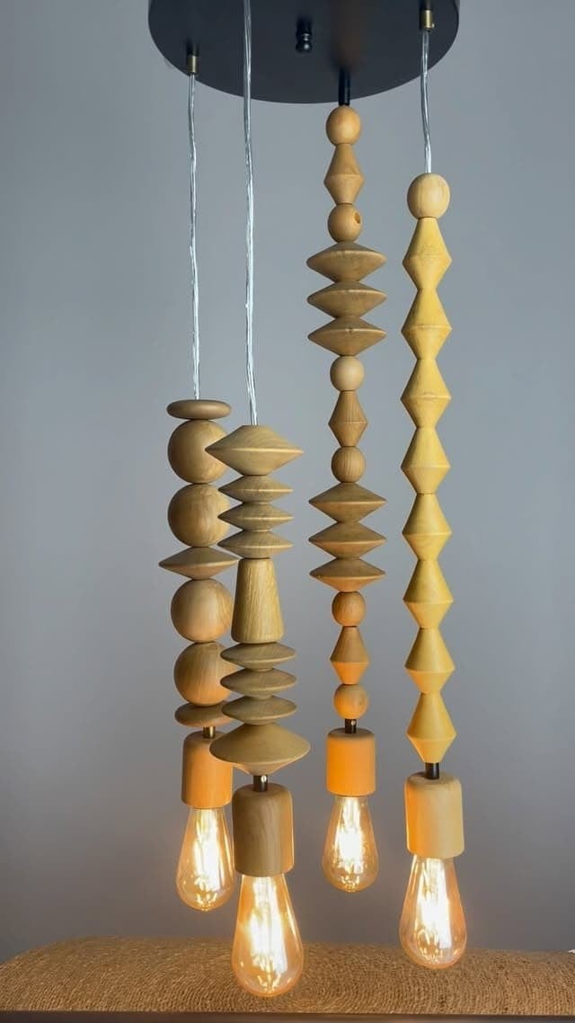 Denna handgjorda pärlhänglampa blandar retrocharm med skandinavisk enkelhet. De naturliga träpärlorna bildar ett geometriskt mönster som kastar varma skuggor, perfekt som mittpunkt i vardagsrummet. Varje hållbart framställd lampa hyllar hantverksmässiga texturer och 1970-talsinspirerade organiska former.