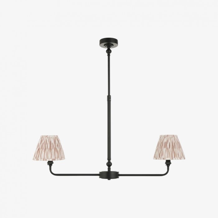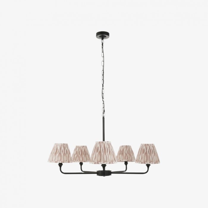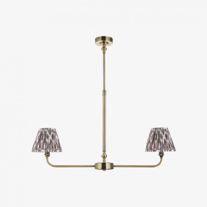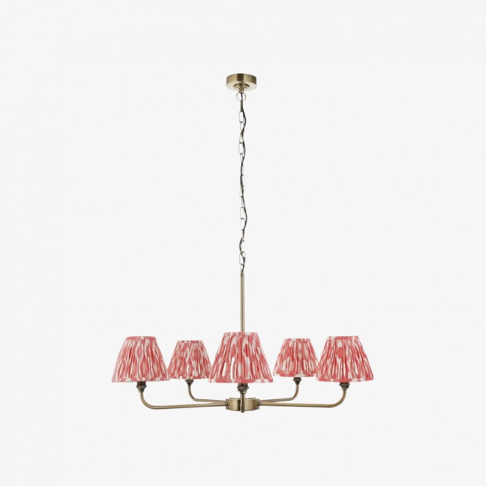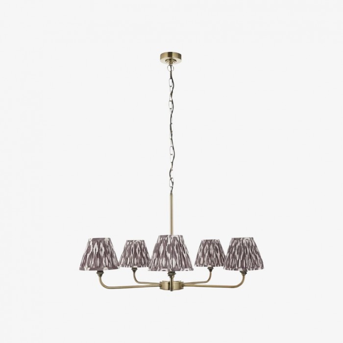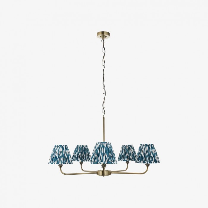 Förhöj ditt utrymme med denna ljuskrona som blandar modern geometri med exotiska ikatmönster. Med en elegant mässingsram eller svart ram och handgjorda tygskärmar i grått, korallrosa, blått eller neutrala toner. Denna mångsidiga konfiguration med 2 eller 5 lamphuvuden skapar en fantastisk blickfångare som är perfekt ovanför köksöar, matbord eller i kommersiella miljöer.